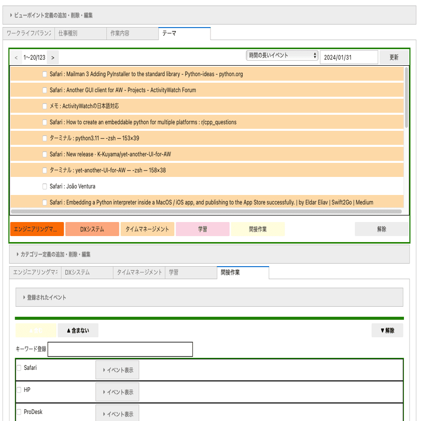 ActivityWatchは、カテゴリー設定を行うために正規表現が必要だったりと、ちょっとハードルが高いところがあります。もう少し簡単に設定ができるように、カテゴリーやキーワードを選んだり入力したりするだけで設定ができるような機能を作ってみました。また、設定画面に記録されているイベントをリスト表示し、設定によってどの時間イベントが何のカテゴリーに分類されるのかを確認しながら設定ができるようにしてみました。