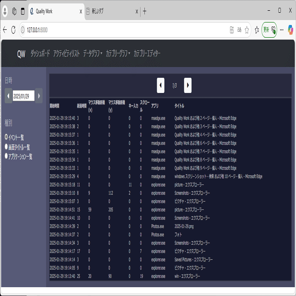 PC画面で、何らかのウインドウがアクティブになるごとに「ウインドウを表示しているアプリケーション名」「ウインドウタイトル」「ウインドウがアクティブになった時刻」「アクティブでなくなるまでの経過時間」を「アクティビティ」として記録します。
