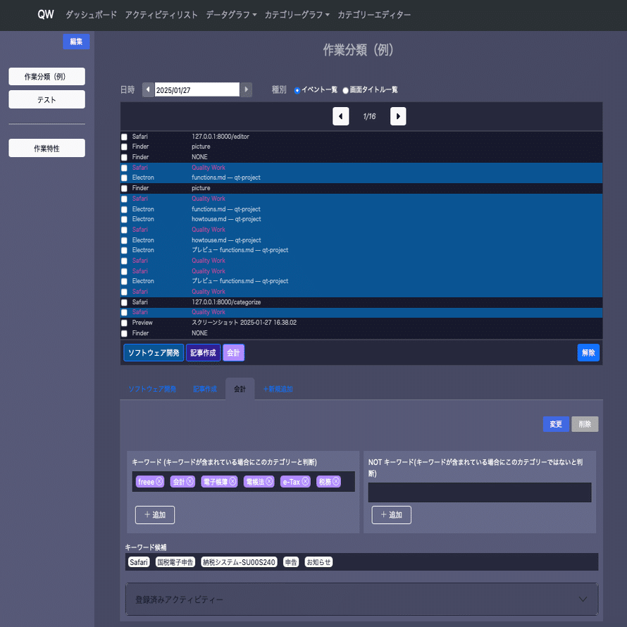 分類するカテゴリーごとに、キーワードを予め登録しておき、アクティビティの持つウインドウタイトルにキーワードが含まれている(あるいは含まれていない)場合に当該カテゴリーに属すると判断します。