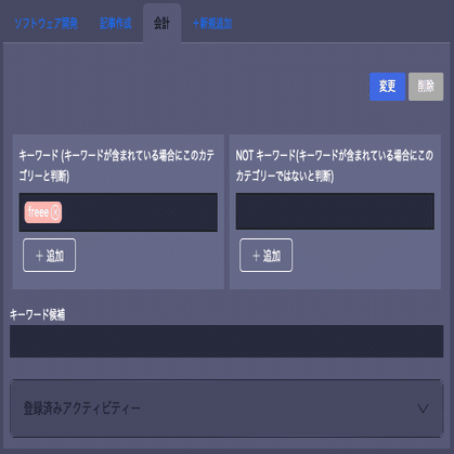 「会計」の関係の作業としては、freeeの会計ソフトサービスを使っているので、キーワードとして「freee」を登録します。