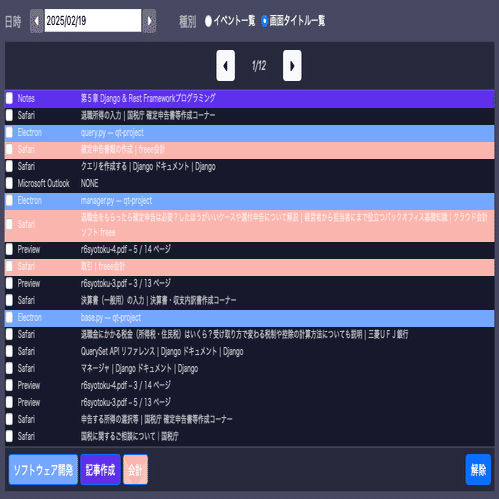 8時台に未分類になっている時間が多いようです。調べてみるとメールを読んだりヤフーニュースを見たりしている時間でした。午前中に確定申告のための「会計」作業をやってますが、午後はソフトウェア開発作業が中心です。16時台にかなり集中して作業をしているようです。