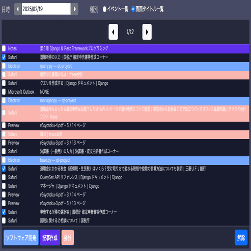 ちょうど確定申告に取り掛かっていた時期なので、その関連の作業が記録されており、これらの作業を会計に分類します。