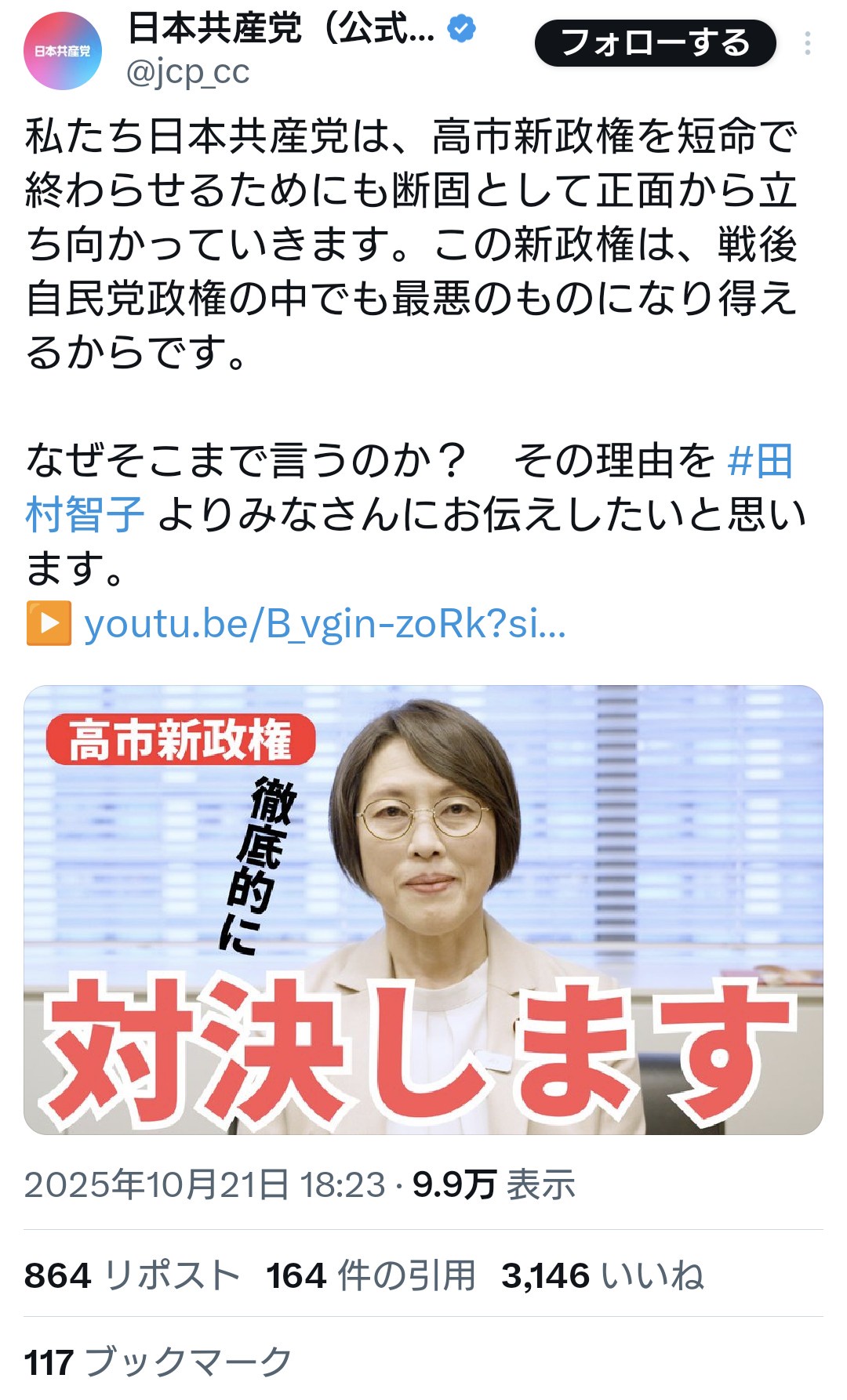 - 【速報】 共産・田村委員長「高市新政権を短命で終わらせるため、徹底的に対戦します」対話をする気はない模様、やはり暴力なのか