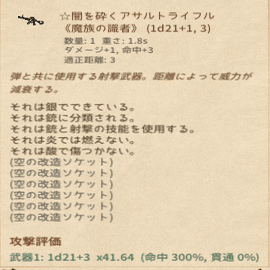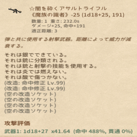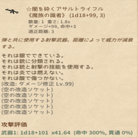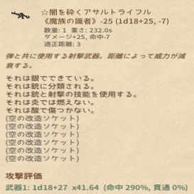 そしてこの状態からダメージ修正を25以上にします。遠隔には改造ソケットがあるのでそれを利用するとよいでしょう。近接の場合は呪い羽で可能です。