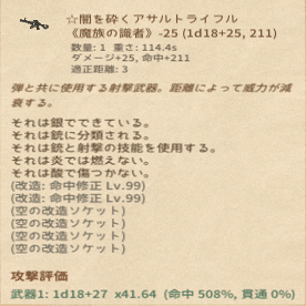 一方で呪われた羽の生えた巻物はダメージ修正が+25~+39かつ命中修正が6以下の時、ダメ修正が+5命中修正が-1されます。