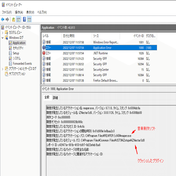 画面中央からクラッシュしてしまったソフトのエラーのログを探します。