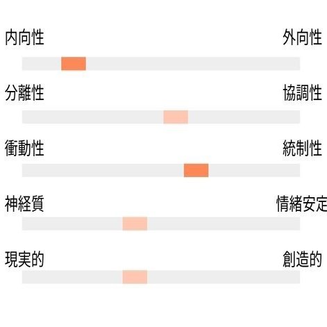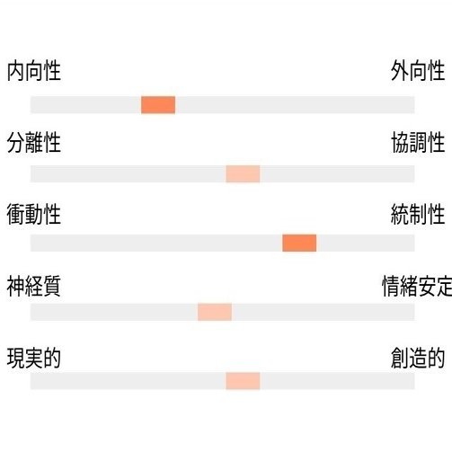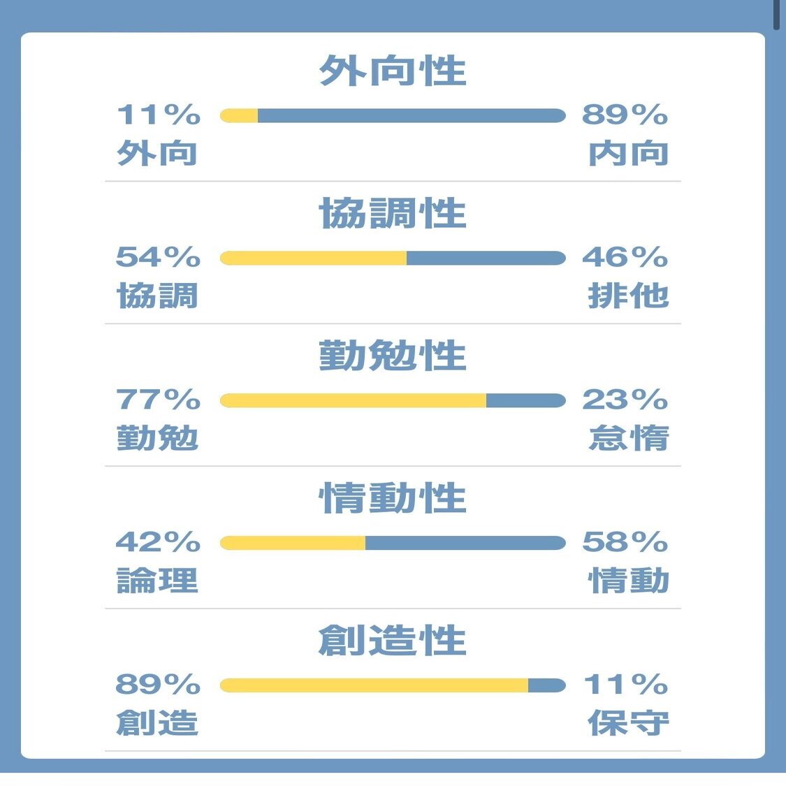 創造性以外は一貫していて、内向的で勤勉的、若干情動的で協調性がほぼ真ん中。という感じですね。