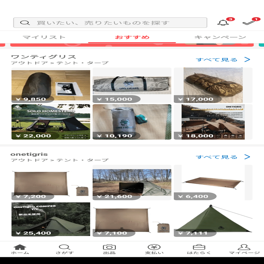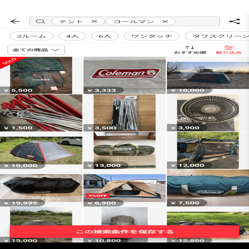 そもそもニコニコの検索、言うほど使いやすいですかね。例えばこれはアプリ版のメルカリの検索画面ですけど、ワードで検索したら勝手にタグとして変換してくれるし、追加したほうがいいワードの候補も出してくれるんですよね。しかも定点観測できるように検索条件をワンボタンで保存できる機能付き。