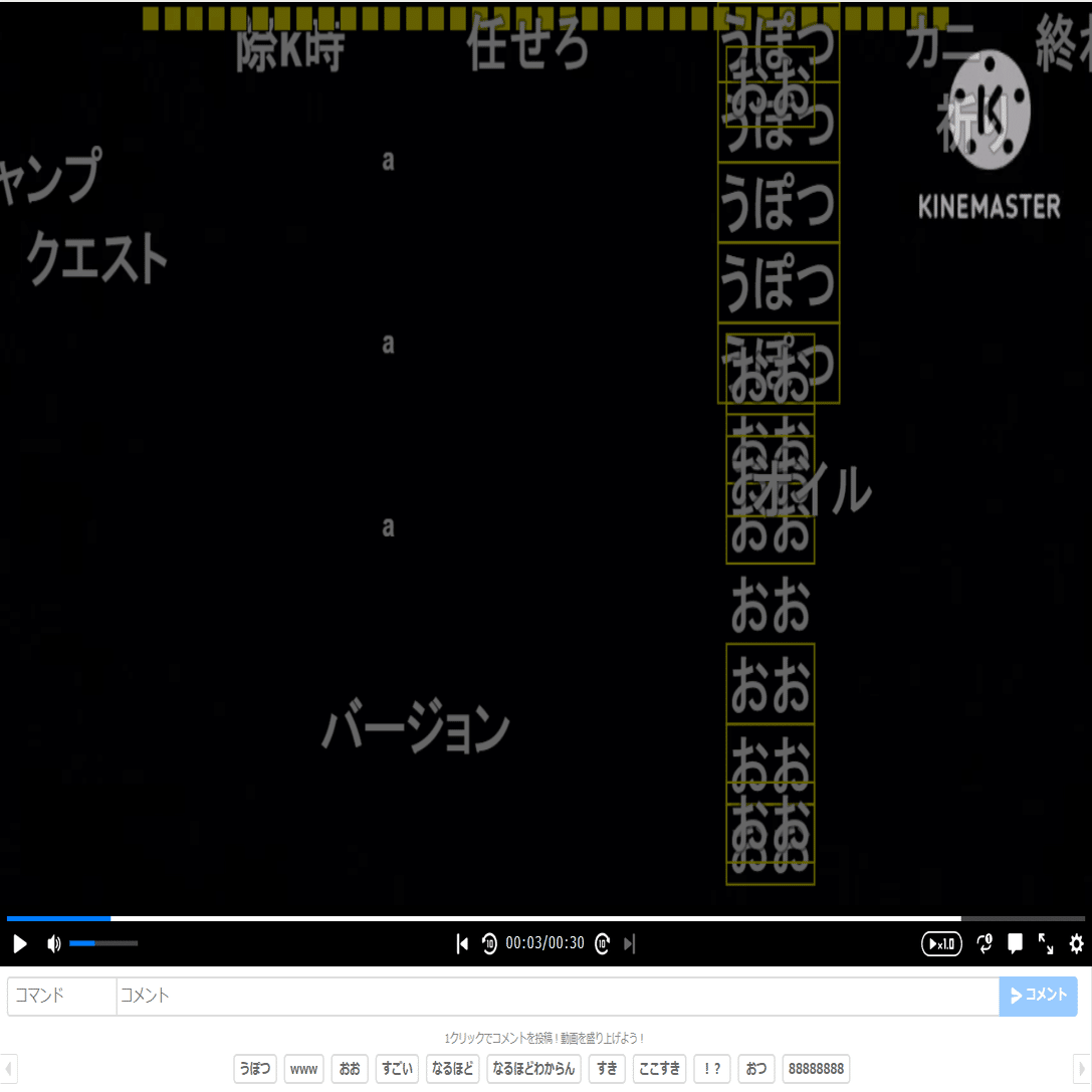これ、連打できてしまうので容易に他の視聴者を不快にさせる荒らしが出来てしまう。かんたんコメントの候補として用意されてるコメント、「うぽつ」「おお」「おつ」「美味しそう」「ええやん」とかで、そんな連打する必要あるようなもの無いのになんで連打出来ちゃうんでしょうか。