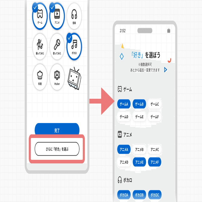 すべてのマイナージャンルが救われるべきとは言わないですが、スマホアプリの初期設定として選ばせられる下の画像の左側の「好み」選択画面を見たときあまりのジャンルの少なさに驚きました。自身のジャンルが含まれてなくて絶望した投稿者も多いんじゃないですか?過疎ジャンルでもいいから網羅的に候補にくらい入れてくださいよ。