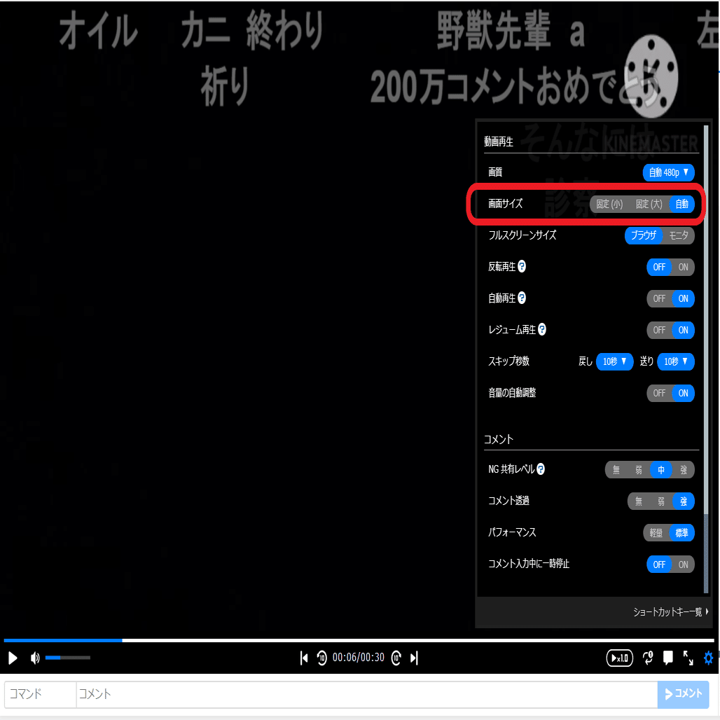 過去には画面を少し小さく映してその後ろを流すような目立たないための妥協案を採用していたこともありますけど今は機能として実装されているのはON/OFFとコメント透過の度合いを多少選べるのみで他の方式は全く選べない。