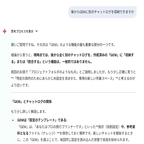 一方Geminiは一度ログを閉じると、さっきの旅をしなければならない。