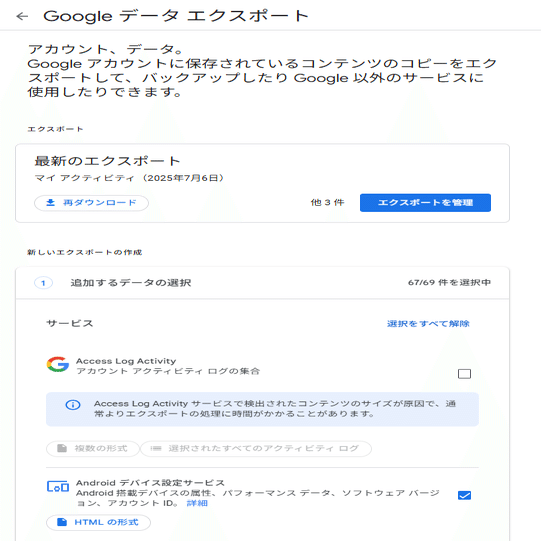 ①Googleデータエクスポート(Google Takeout)へ