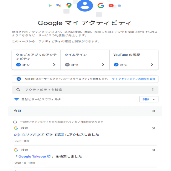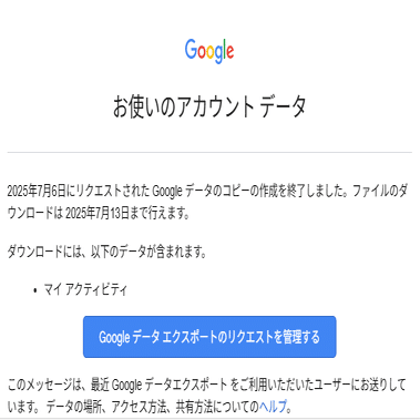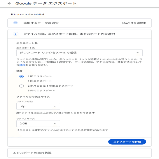 ・Googleアカウント>データとプライバシー>データダウンロード、削除>データをダウンロード