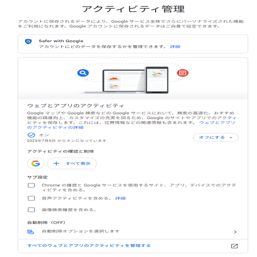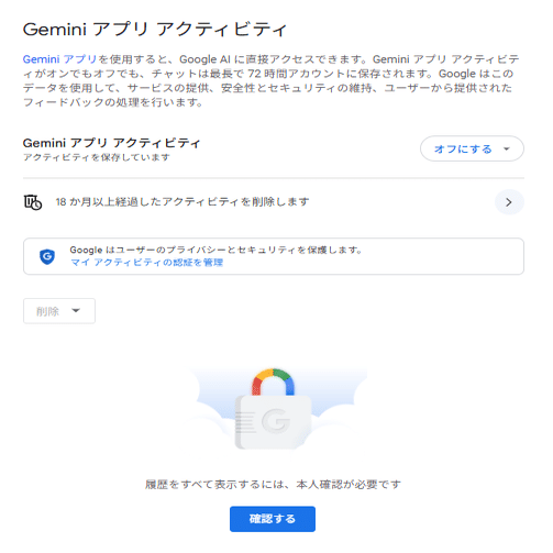 💡下画像の感じの画面になるで、「Gemini アプリ アクティビティ」を探す。