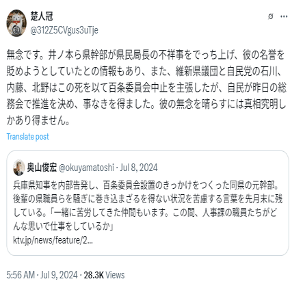 楚人冠氏は奥山氏ツイートをしばしば引用している。たとえば、これは2024年7月9日。ずいぶん踏み込んだ内部事情を伝えている。