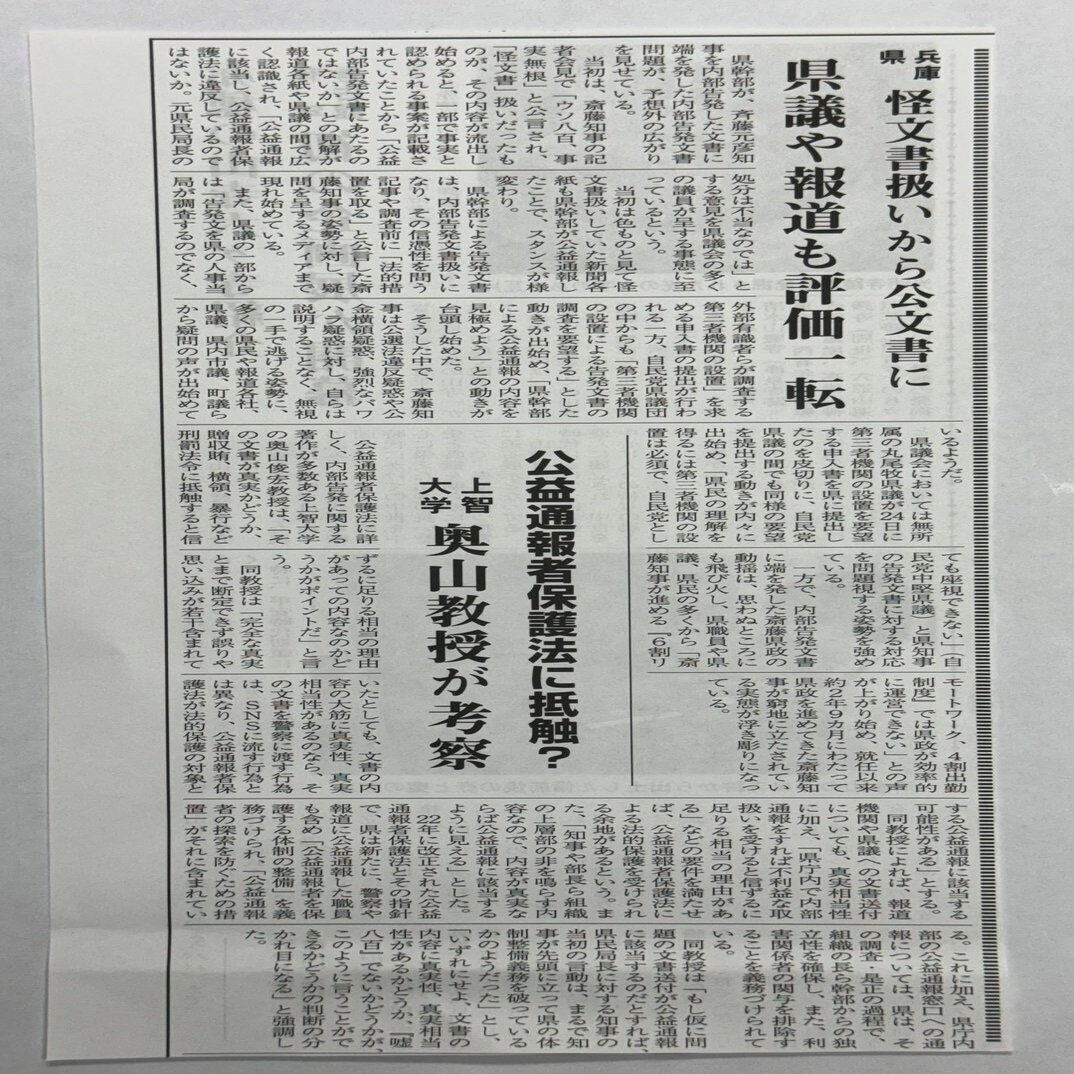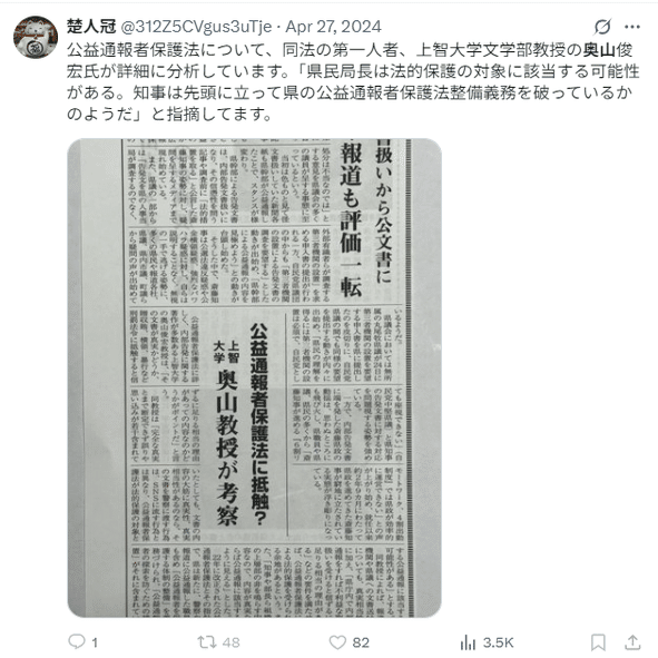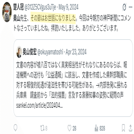 遡ってみると、2024年4月27日に「公益通報者保護法について、同法の第一人者、上智大学文学部教授の奥山俊宏氏が詳細に分析しています」と赤穂新聞を転載して奥山氏を紹介している。