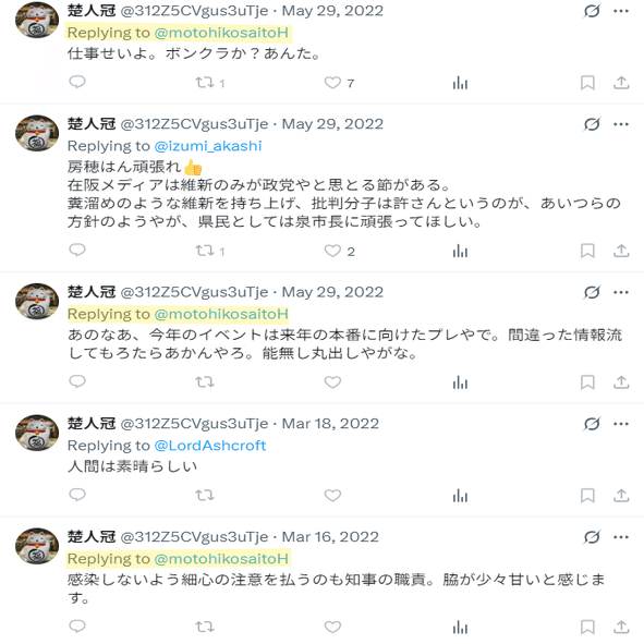2022年は2月に5ツイートと少し多くなったあと、3月の2ツイートのうちひとつで斎藤知事への初めての返信ツイートをした。5月には斎藤知事への返信ツイートを2つしている。