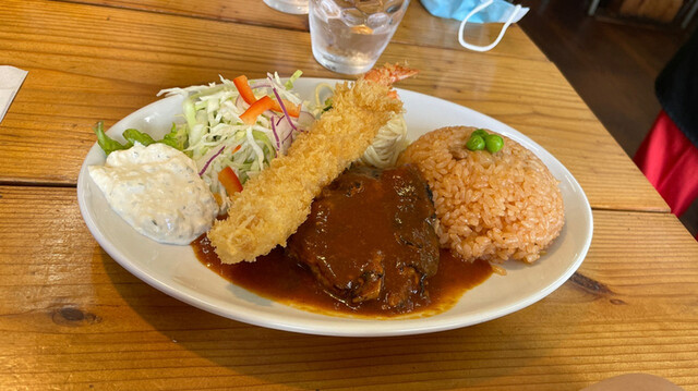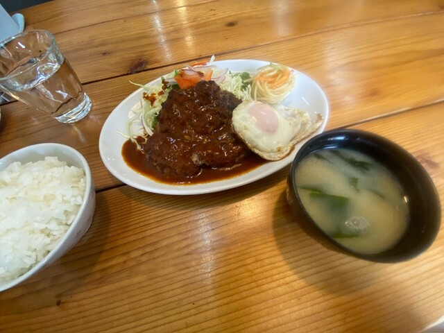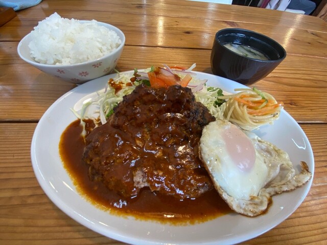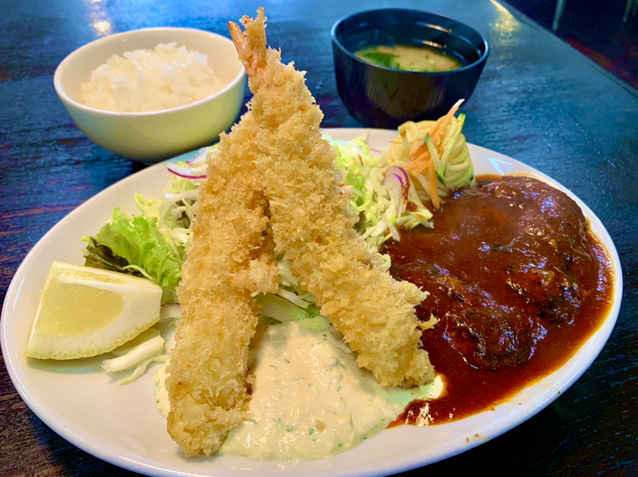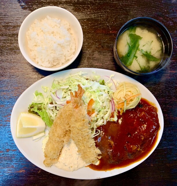 間口は狭いですが、広ーい店内。 全部テーブル席でゆったりとお食事できます。 ハンバーグとエビフライのセットAランチにしました。ご飯とお味噌汁がセットです。 熱々フワフワのハンバーグ、サイコー! 箸で切るとジュワッと肉汁。ひと口ごとにたっぷりかかったソースを絡めながらいただきます。ご飯がす... 詳細を見る