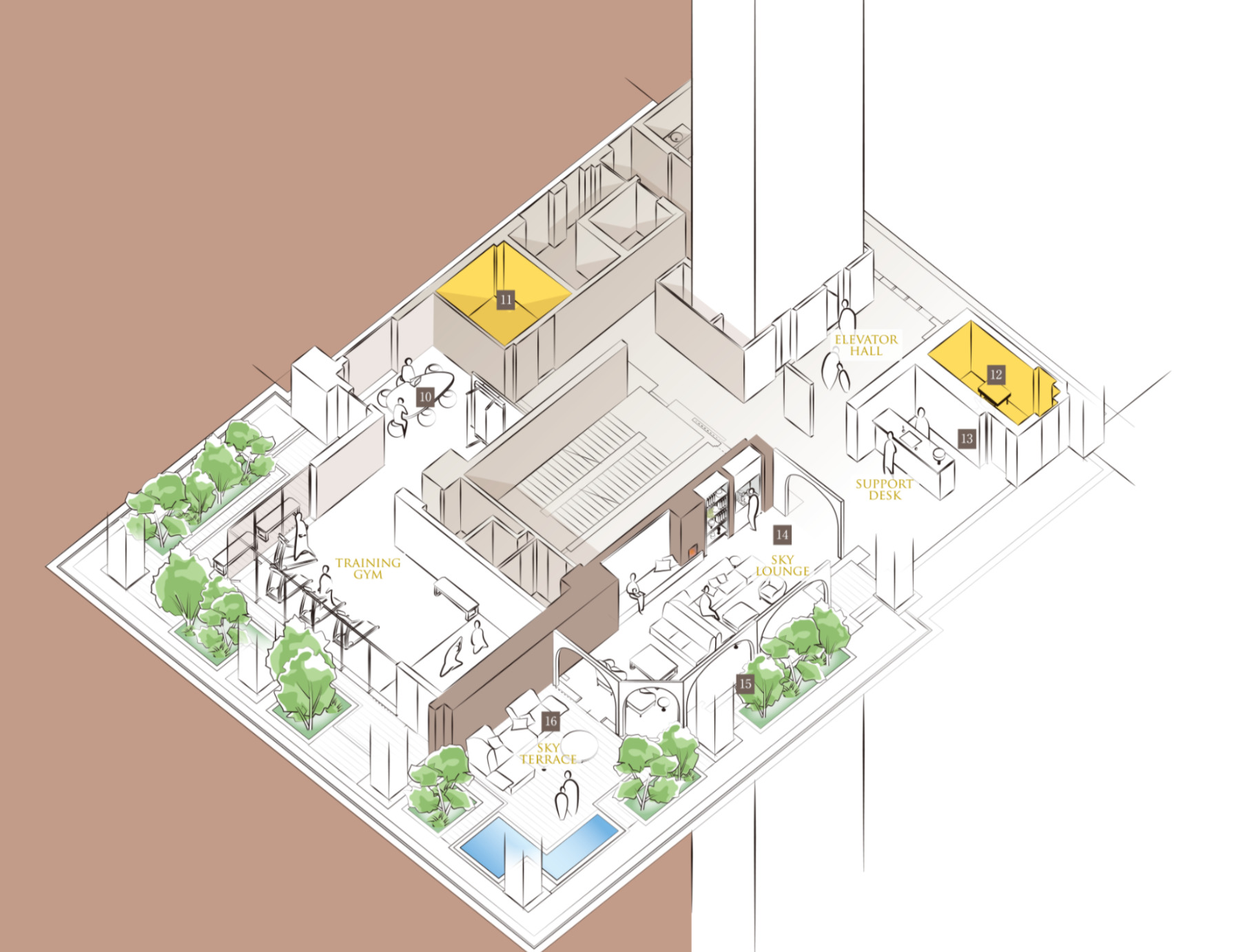 空と植栽を見ながら運動ができるジムです。雨の日のちょっとした気分転換などによさそうです。バランスボールを椅子替わりに利用するエクササイズミーティングエリアもあるようです。住民同士がここに座りあってテレワークしていたらややシュールですが(笑) 面白い施設だとは思います。