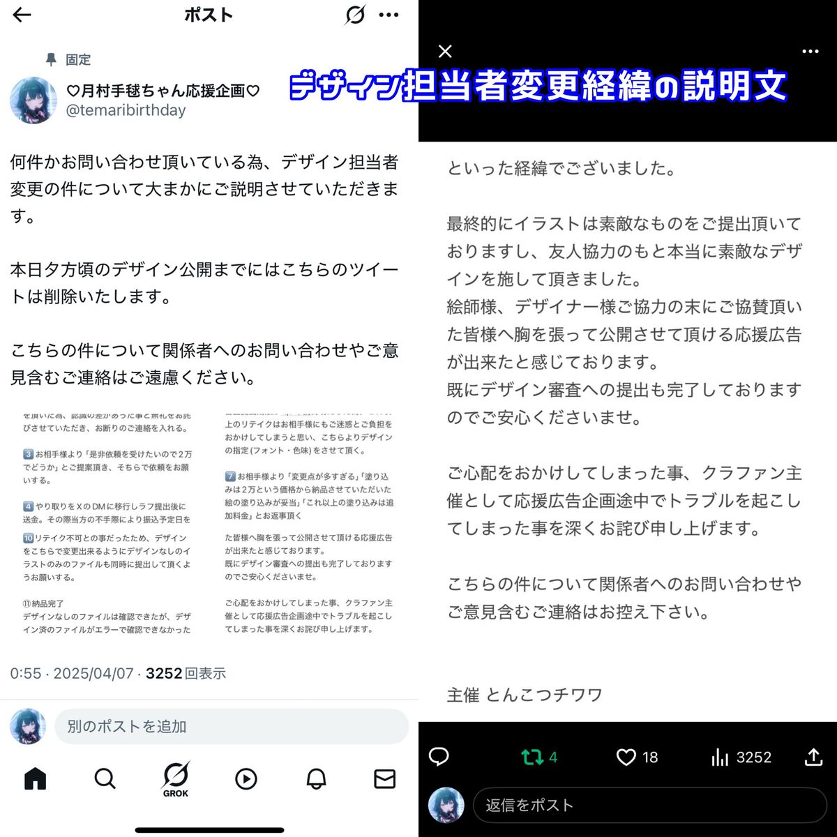 この度は、応援広告企画、また協賛者様、ならびに主催者であるとんこつチワワ様にご迷惑をおかけする形になって大変申し訳ございませんでした。この場を借りて、誠心誠意謝罪させて頂きます。