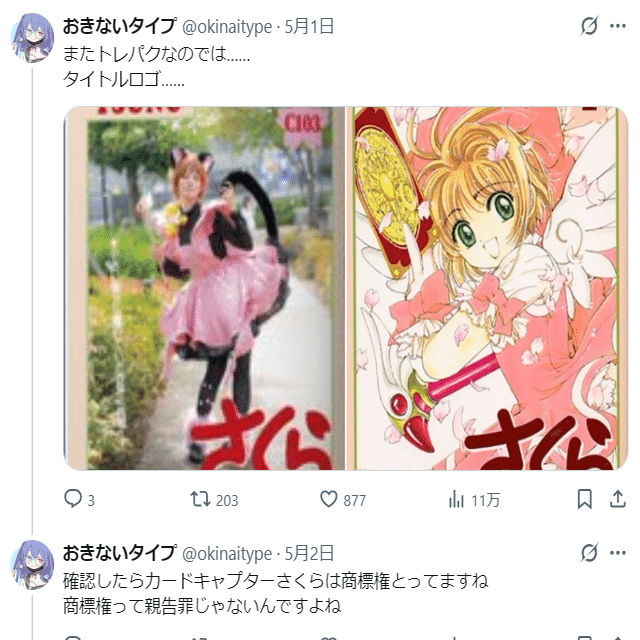 事例もいくつか紹介されています。鹿氏の例では「カードキャプターさくらに由来する」という表示に過ぎないわけです。よって商標権侵害は否定されました。チャンチャン。