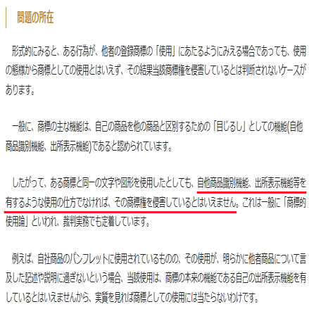 要は「商標が使われているように見えても、それが『自分の商品の出所を示すため』に使われていない」のであれば侵害は無いというものです。