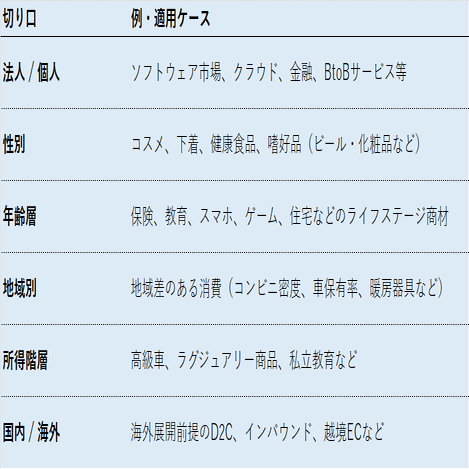 └ 年齢層/男女/利用頻度など、自然に“層”を切れるか?仮置き値は“直感ジャンプ”でOKだが、根拠をセットで