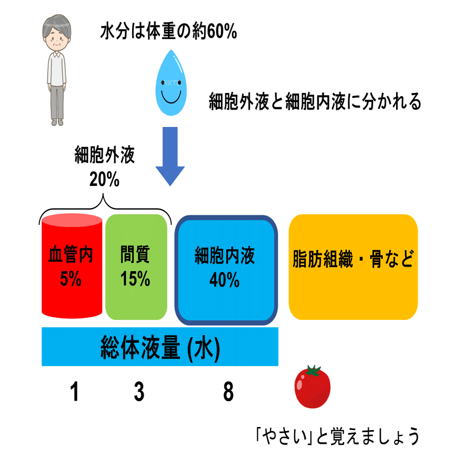まとめると下図になります。血管内:間質:細胞内液=1:3:8となり、やさい(831)と覚えましょう。