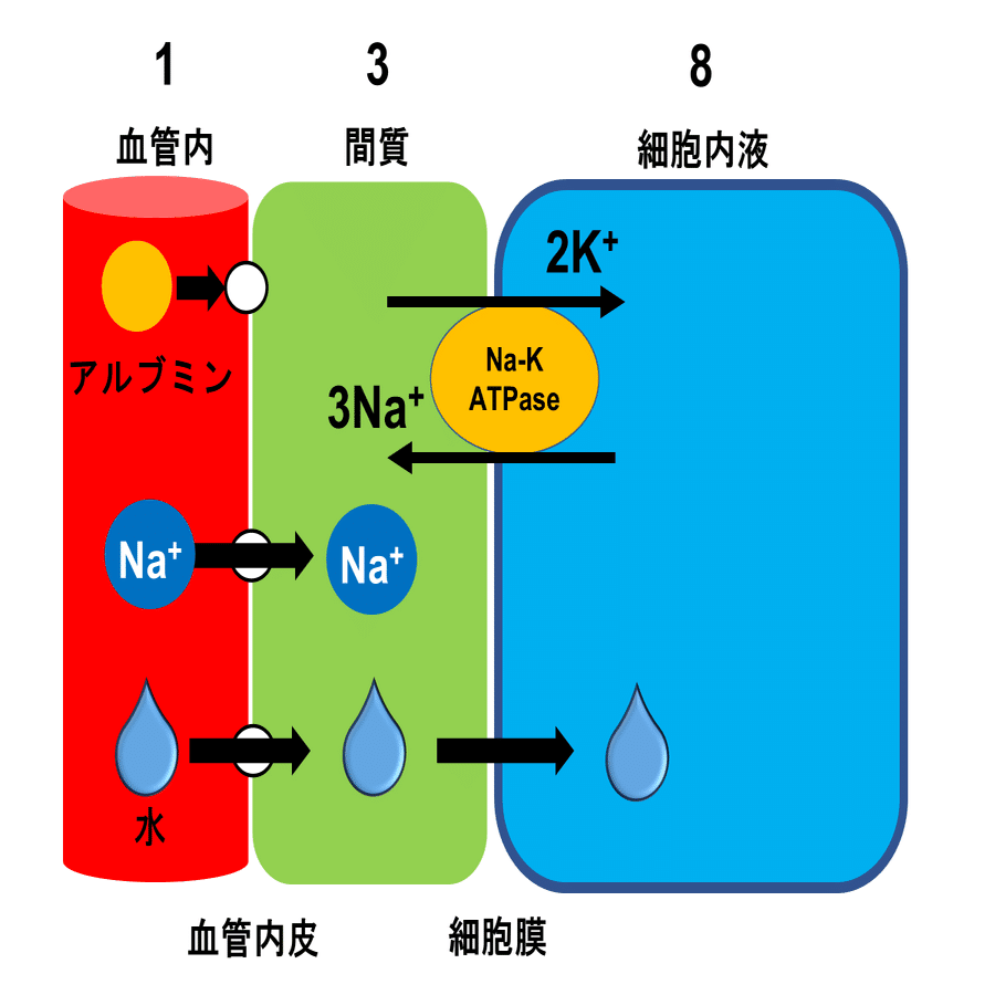 血管内と間質の間は血管内皮細胞があります。アルブミンのような高分子量の物質は通ることができません。また、間質と細胞内液の間には脂質二重層の細胞膜があります。Naイオンは血管内皮細胞を通ることができますが、脂質二重層は通過することができないため、細胞外液へ留まります。一方で、水は細胞内外を自由に移動することができます。