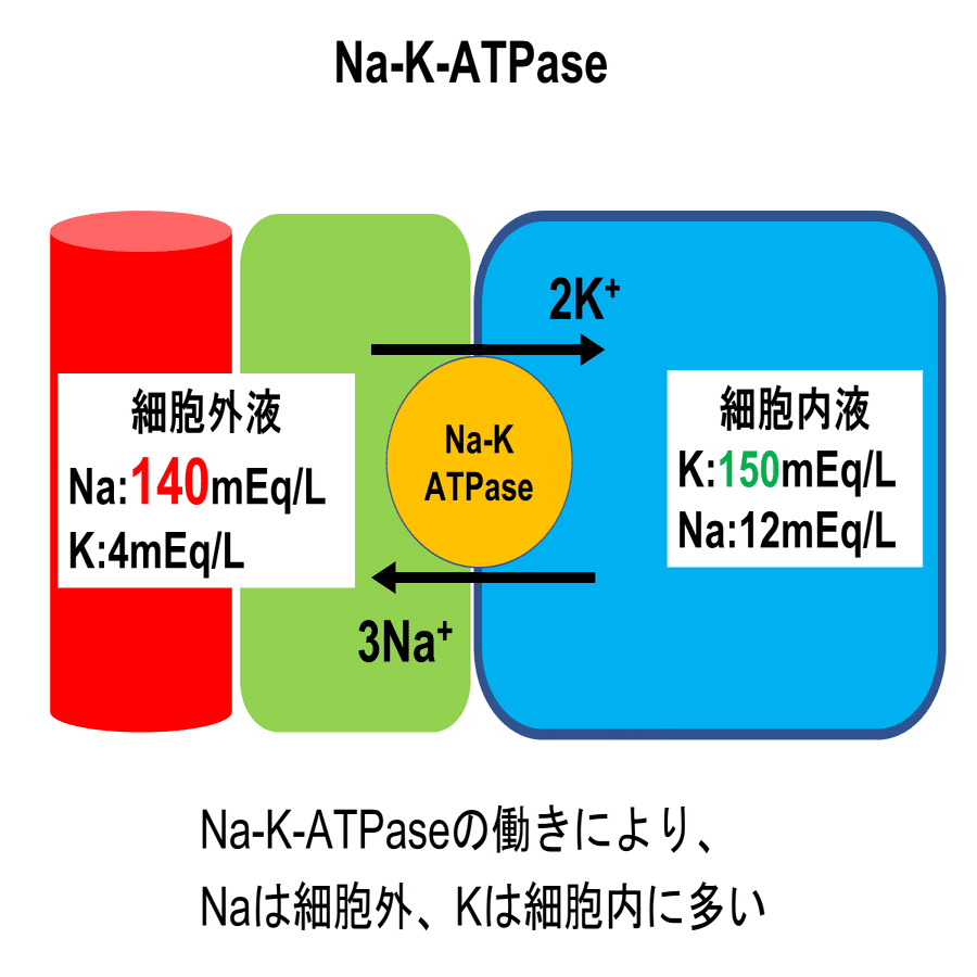 具体的にはエネルギー(ATP)を消費してNaイオンを3つ細胞外へ移動させ、Kイオンを2つ細胞内へ移動させています。結果、Naイオンが細胞外に、Kイオンは細胞内に多く分布しています。我々が採血結果で確認するのは細胞外液の組成になりますが、細胞外液にはNaイオンは約140mE/L、Kイオンは約4mEq/L存在しています。