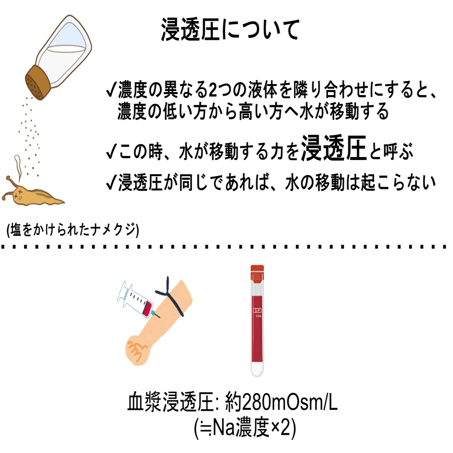 浸透とは、濃度の異なる2つの液体を隣り合わせにした際に、「濃度の低い方から濃度の高い方」へ水が移動することをいいます。このときに水が移動する力を浸透圧と呼びます。野菜に塩を振ると水が抜けて柔らかくなったり、ナメクジに塩をかけると小さくなるのは浸透圧によります。逆に、濃度が同じであれば水の移動は生じません。血液にも浸透圧が存在しています。実際はもう少し複雑な式となりますが、現時点ではNa濃度の約2倍(140×2≒280mOsm/L)と覚えておきましょう。