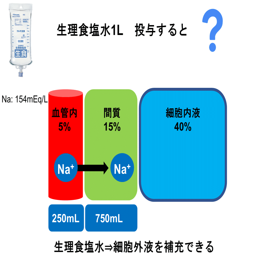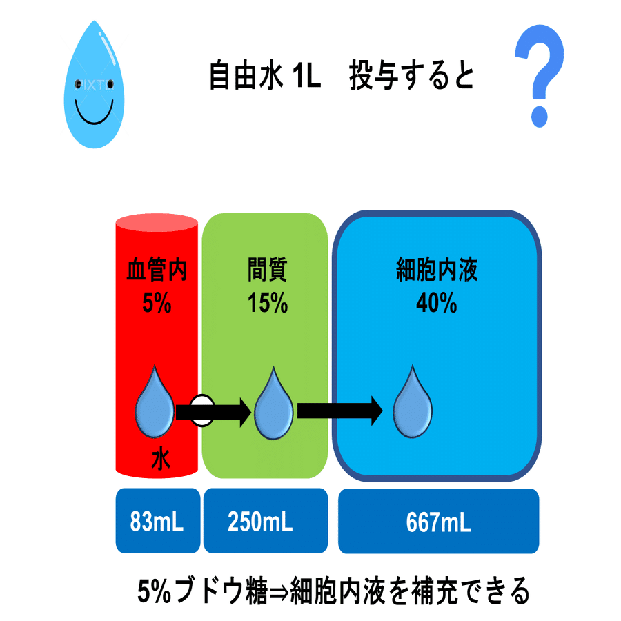 生理食塩水が外液に、5%ブドウ糖が血管内:間質:細胞内液=1:3:8の比率で分布することを思い出してみると…