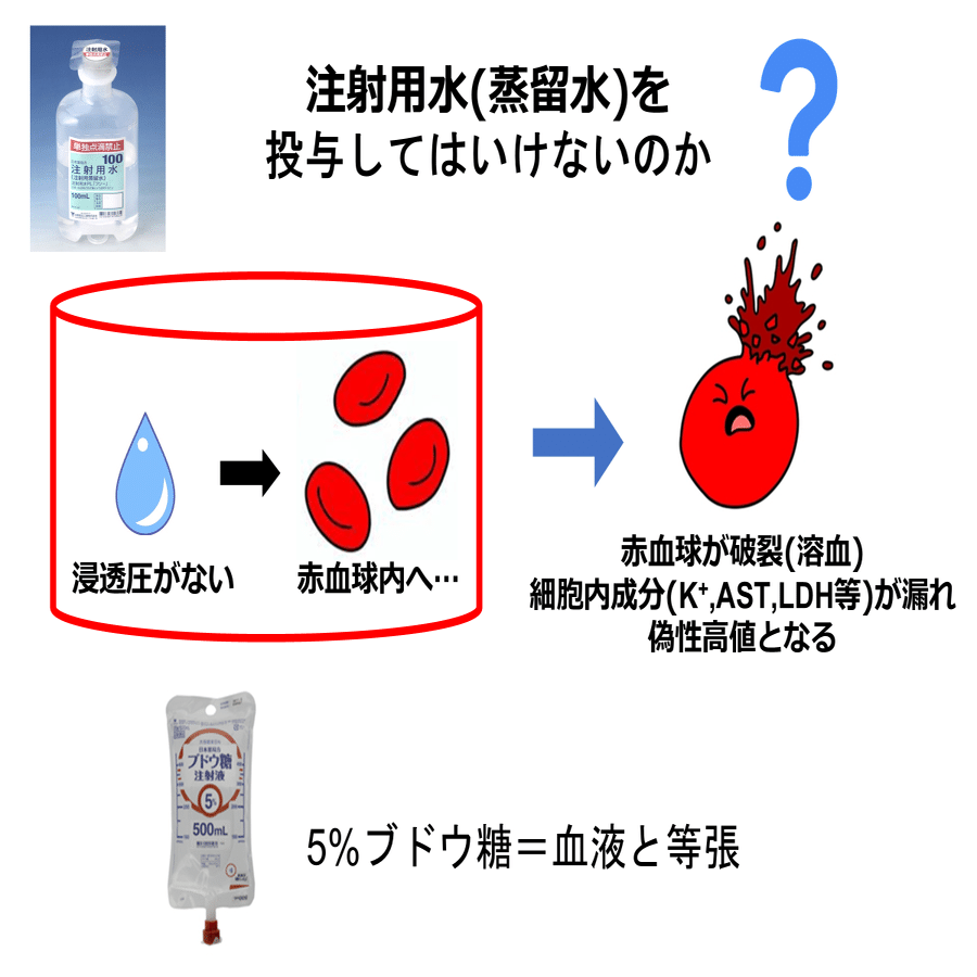ところで、5%ブドウ糖液ではなく、注射用水(蒸留水)を投与してはいけないのでしょうか?答えはNoです。注射用水は浸透圧がないため、その血管内へ投与した場合、血管内の赤血球内に水が移動し、最終的に赤血球が破裂(溶血)してしまいます。5%ブドウ糖液はブドウ糖を混ぜることで血液と等張になっているため、溶血を起こすことはありません。