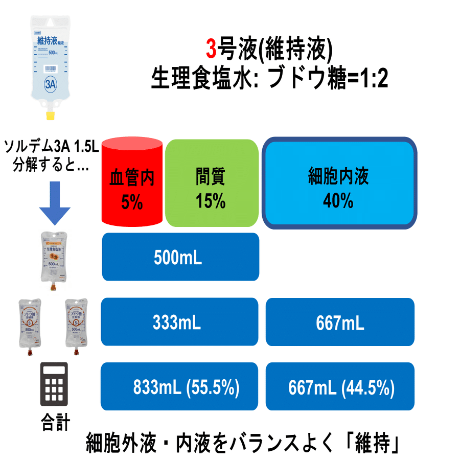 結果的に、細胞外液と細胞内液には「ほぼ50%ずつ」水分が分布しています。3号液は別名「維持液」とも呼ばれますが、バランス良く維持していることがわかります。