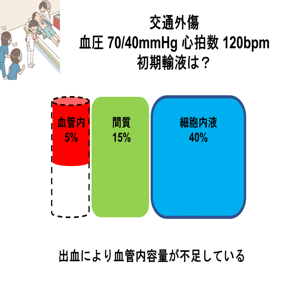 輸血の準備には時間がかかりますので、初期治療としてはまず輸液を投与することとなります。出血しているということは、細胞外液の中の血管内のボリュームが不足しているということですので、血管内の水分量を効率的に増やせる輸液を選ぶ必要があります。