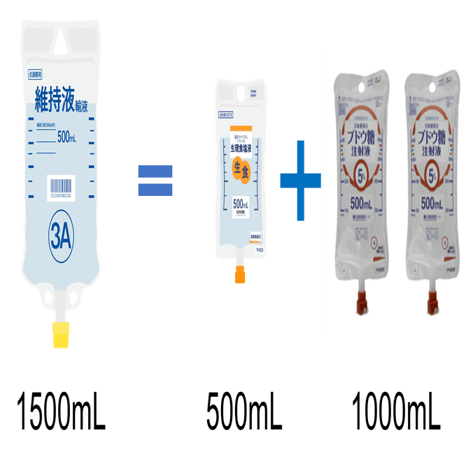 ソルデム3A 1500mL = 生理食塩水 500mL + 5%ブドウ糖 1000mLですね。