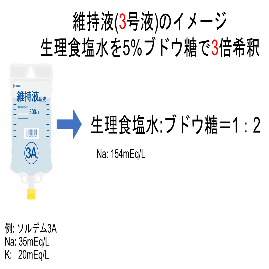 3号液は生理食塩水を5%ブドウ糖液で3倍希釈したものと考えると分かりやすいです。