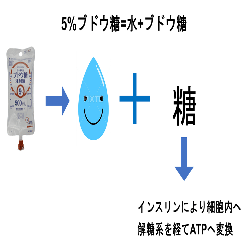 5%ブドウ糖は水にブドウ糖を溶かしたものになります。