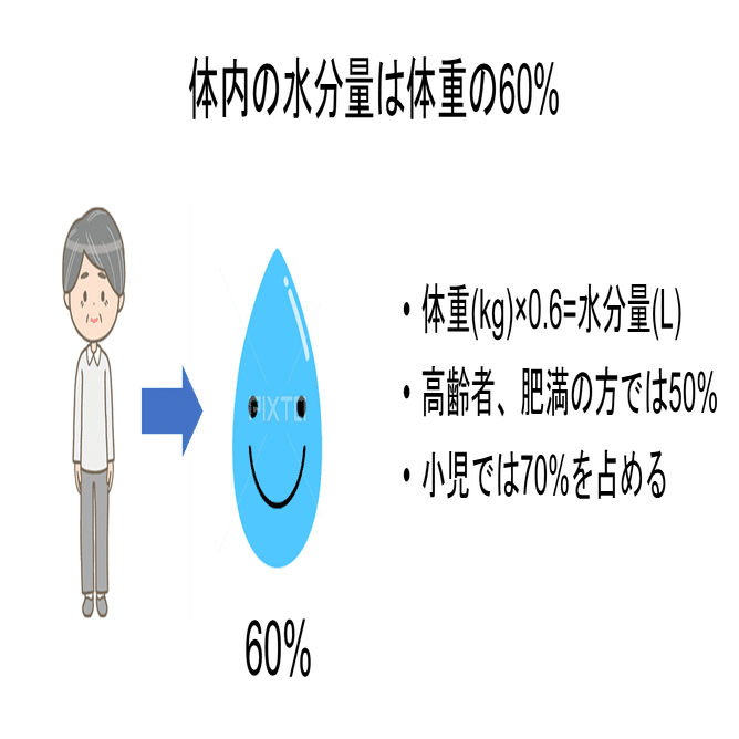 この割合は患者背景により増減することもあります。例えば小児であれば70%、脂肪の多い肥満患者や水分の少ない高齢者であれば50%とされることもありますが、臨床においてはざっと60%前後と認識しておいて何ら問題はありません。50kgであれば水分は30L、100kgであれば水分は60Lといった具合です。