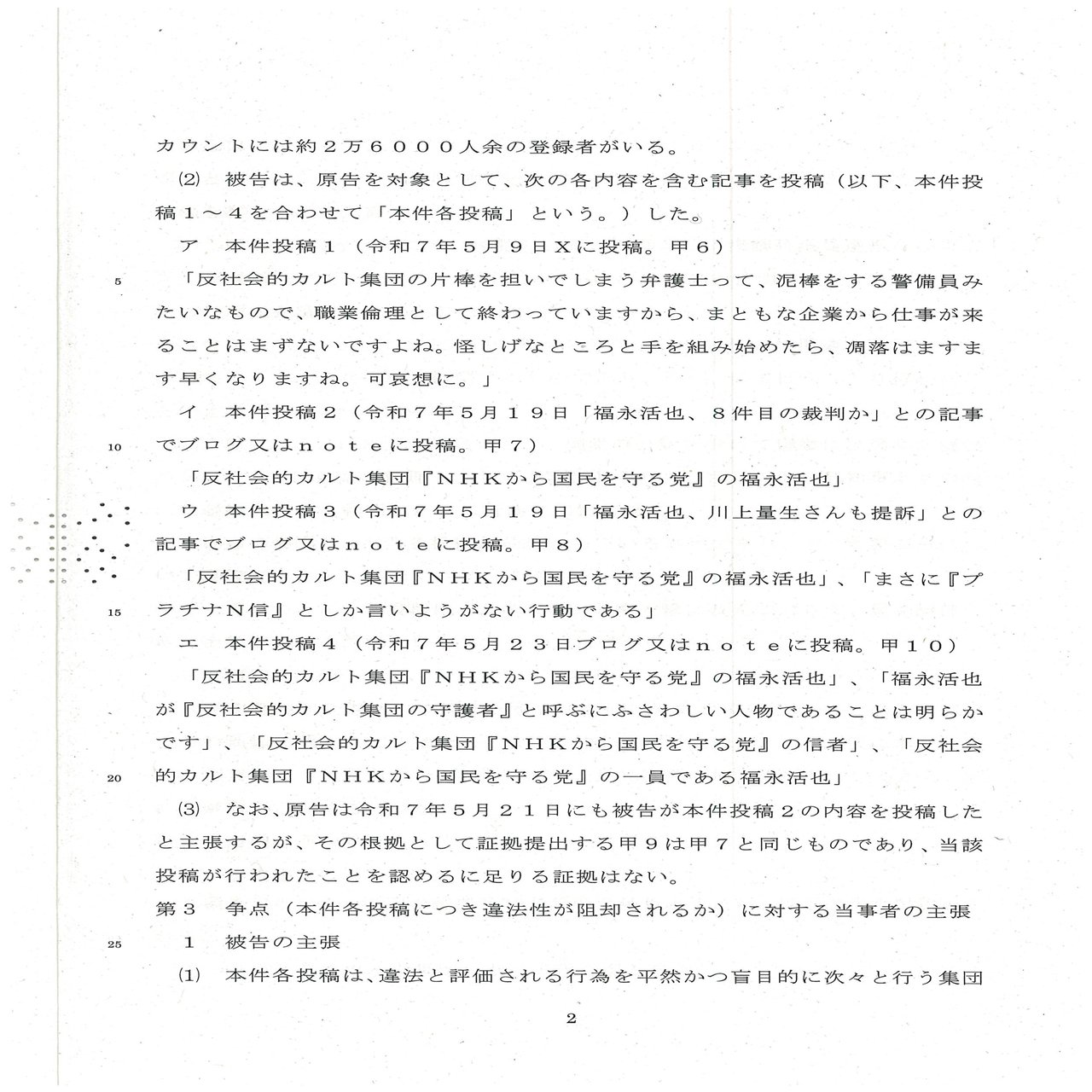 NHK党は、令和6年、被告がNHK党を「反社会的カルト集団」と指摘したXの投稿等が名誉毀損にあたると主張して、被告に対し、損害賠償を求める訴えを東京地方裁判所に提起した。
