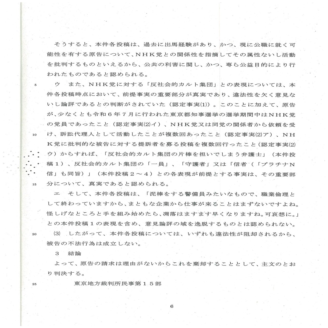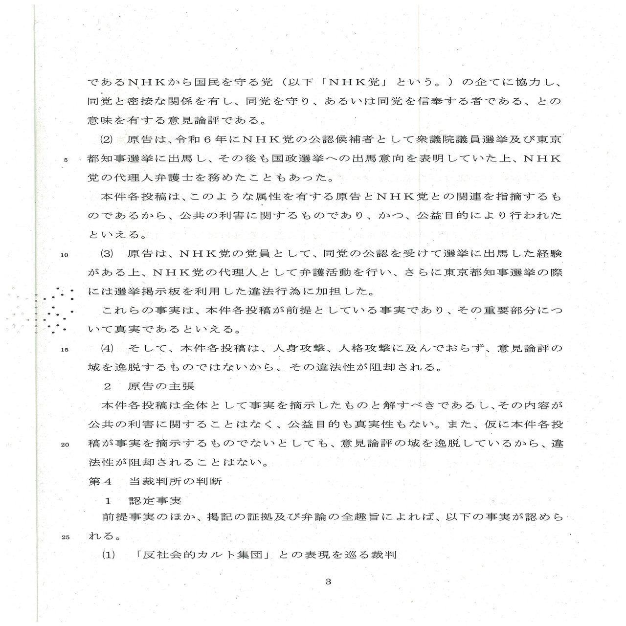 ウ また、NHK党に対する「反社会的カルト集団」との表現については、本件各投稿時点において、前提事実の重要部分が真実であり、違法性を欠く意見ないし論評であるとの判断がされていた(認定事実(1))。このことに加えて、原告が、少なくとも令和6年7月に行われた東京都知事選居の選挙期間中はNHK党の党員であったこと(認定事実(2)イ)、NHK党又は同等の関係者から依頼を受け、訴訟代理人として活動していたことが複数回あったこと(認定事実(2)ア)、NHK党に批判的な被告に対する提訴者を募る投稿を複数回行ったこと(認定事実(2)ウ)からすれば、「反社会的カルト集団の片棒を担いでしまう弁護士」(本件投稿1)、反社会的カルト集団の「一員」、「守護者」又は「信者(「プラチナN信」も同旨)」(本件投稿2~4)との各表現が前提とする事実は、その重要部分について、真実であると認められる。