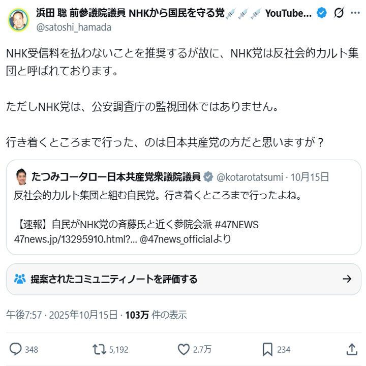 これだけは明確に言っておかなければなりませんが、立花孝志や浜田聡は自分たちが裁判で「反社会的カルト集団」と認められたことについて、「NHKの受信料を不払いを推奨しているから、そう言われるようになった」と嘘の説明をしています。口を開けば嘘と臭い息しか出てこない立花孝志ですから、立花孝志や浜田聡の説明は、だいたい嘘だと思ってください。