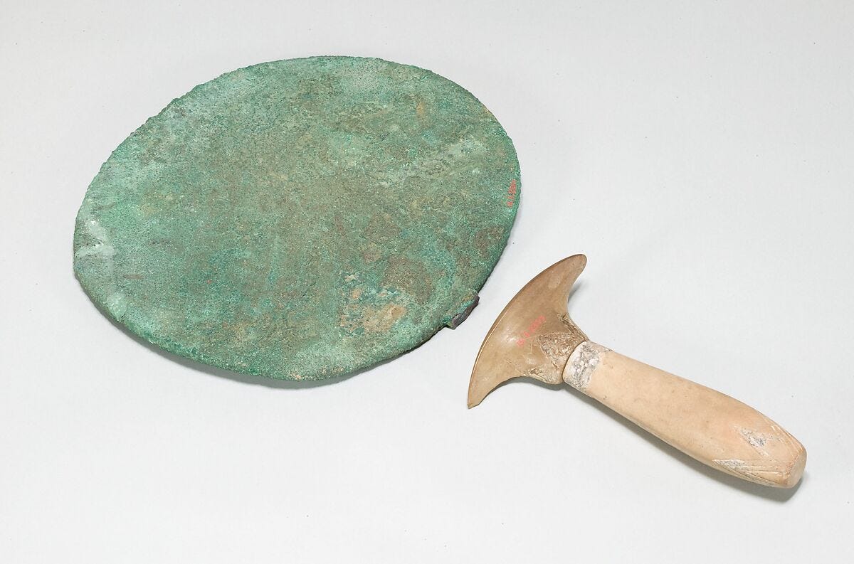 Hathor was the ancient Egyptian goddess of love, beauty, and fertility. She was often depicted as having the head or horns of a cow, which would be topped with the disk of the sun — something quite like the mirror above. Using these mirrors, women would make themselves more beautiful with the goddess of beauty looking on. The way in which mirrors resembled the sun (and its attendant deities) would have been religiously significant as well; mirrors were often flatter at the top to resemble the sun on the horizon: