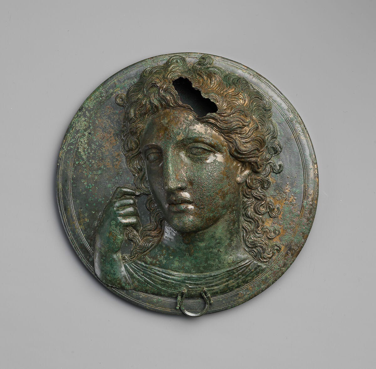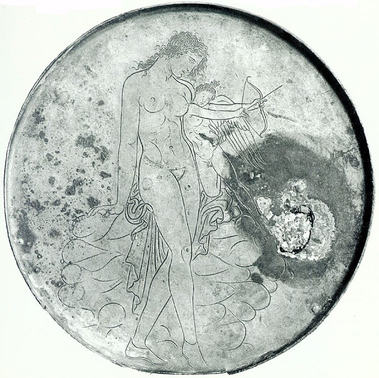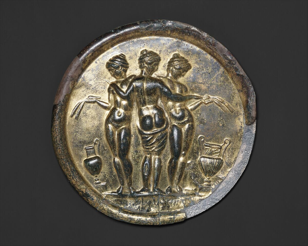 The backs of mirrors featured all sorts of mythological scenes. This one shows the Three Graces: