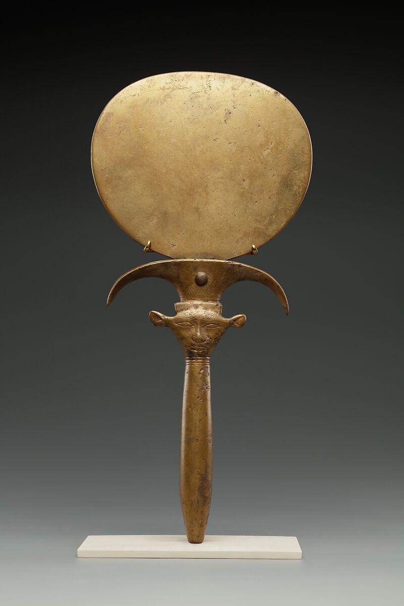 Egypt was a famously appearance-oriented society; archaeologists have found all sorts of beauty products and cosmetics, and it makes sense that Egyptians would have wanted to see themselves in the mirror. But mirrors also had a religious significance, and it had to do with the face staring back at us from below this mirror: