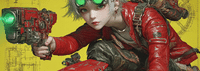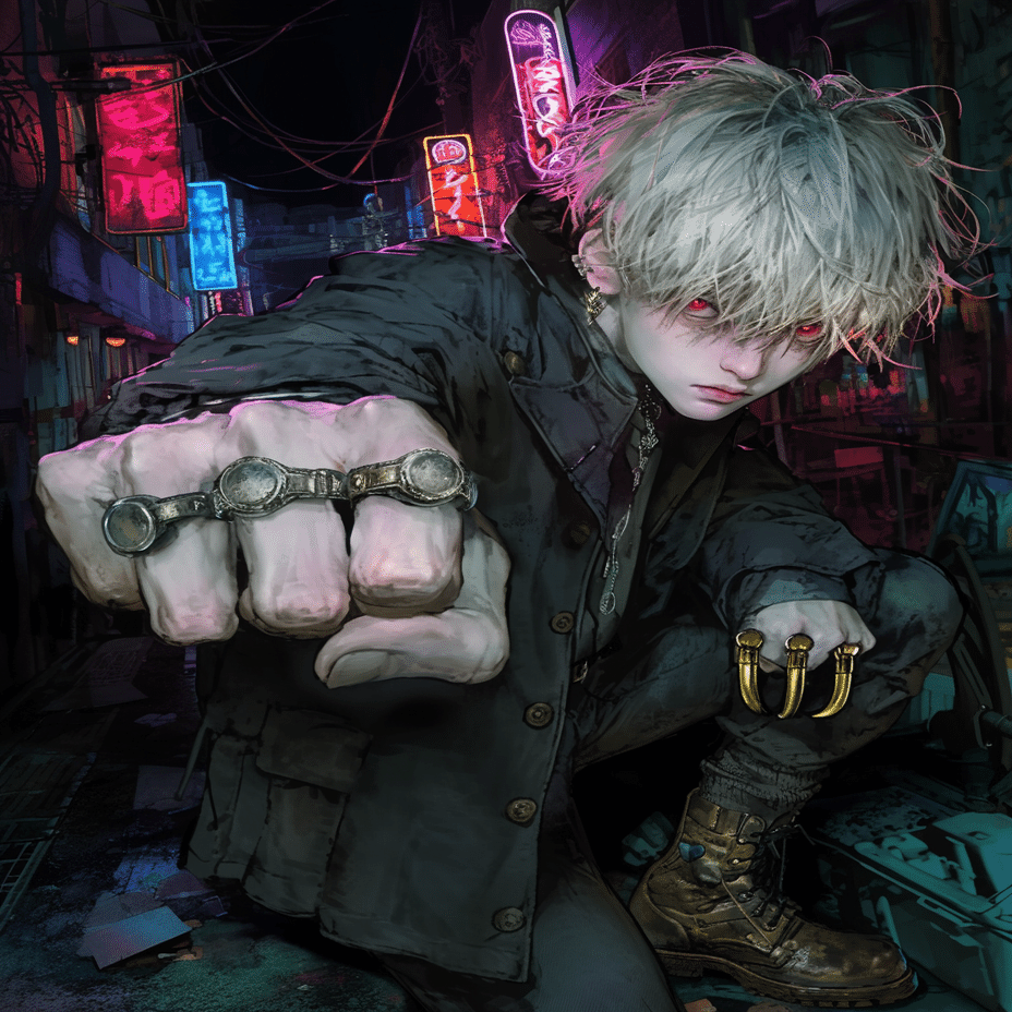 Background: dark alley with neon signs