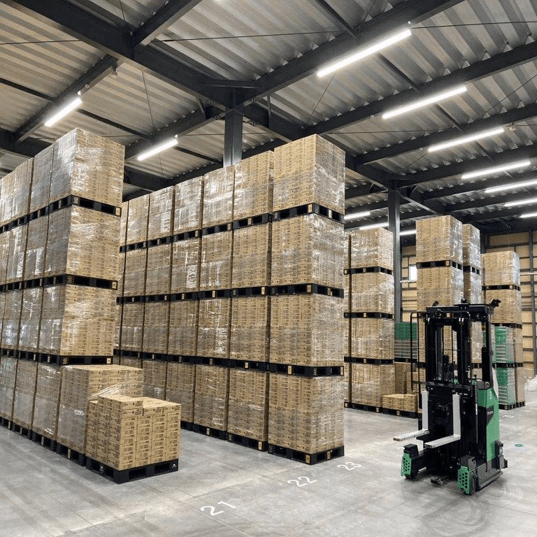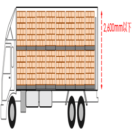 大型トラックの荷室は、パレット2段積みで2,600㎜以下にする必要があります。カルビーグループでは2,500㎜以下を標準としています。