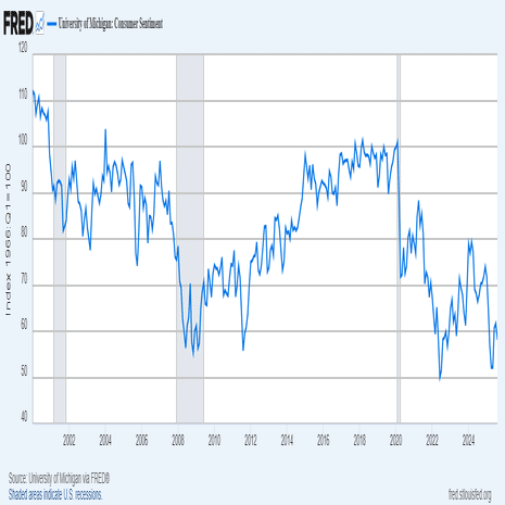 いま大勢の人たちの脳裏でざわついている問題といえば,これだ:「なんでアメリカ経済は持ちこたえてるんだろう?」 トランプ関税で製造業は大打撃を受けているし,雇用統計の数字もふるわないし,消費者感情は2008年からの大不況レベルにまで落ちている: