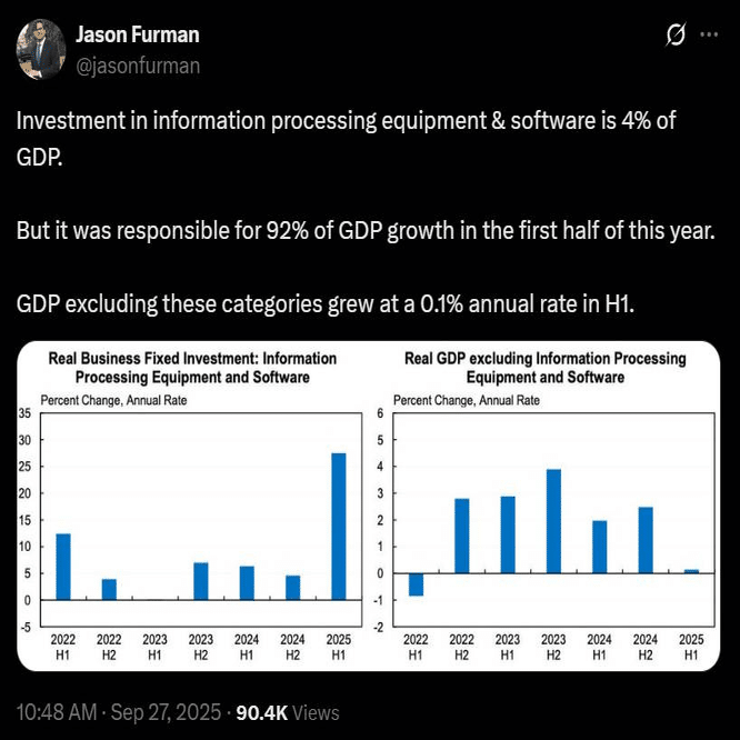 ジェイソン・ファーマン: 情報処理設備とソフトウェアの投資は GDP の 4%.ところが,今年上半期の GDP 成長の 92% をこれが占めている.これらを除外すると,GDP 成長は H1 に年率 0.1 % になる.